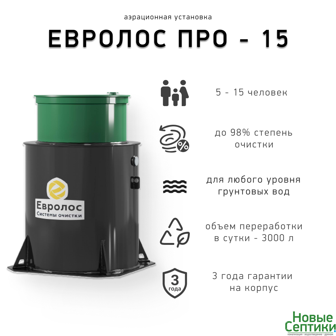 Компрессорная установка глубокой биологической очистки Евролос ПРО 15 для автономной канализации в частном доме постоянного проживания, административного здания, мини-гостиницы или точки питания. Подойдет для участков с низким уровнем грунтовых вод. Может обслуживать до 15 человек при постоянном проживании или очистки 3000 литров сточных вод в сутки. Эффективно работает в любых климатических условиях.