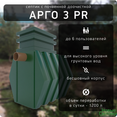 Энергонезависимый септик Арго 3 PR для 6 пользователей. Классический пластиковый септик Арго с почвенной доочисткой. Прочный, литой корпус и небольшие размеры - основные преимущества септик Арго. Используется для обустройства канализации в частном доме или на даче при сезонном или постоянном проживании. Подойдет для участков с высоким уровнем грунтовых вод.