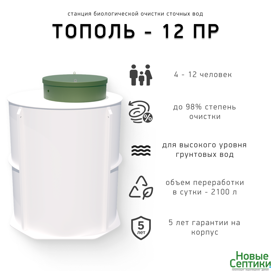 Автономная система канализации «Тополь - 12 ПР» предназначена для эффективной очистки бытовых сточных вод в загородных домах и на дачах. Она рассчитана на обслуживание семьи численностью от четырех до двеннадцати человек и подходит как для постоянного проживания, так и для сезонного использования. Септик «Тополь» отличается высоким качеством очистки и соответствует современным экологическим стандартам. Очищенная вода может сбрасываться на рельеф, а осадок после очистки можно применять в качестве удобрения для неплодоносящих культур.
